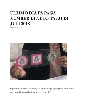 ULTIMO DIA PA PAGA NUMBER DI AUTO TA: 31 DI JULI 2018 3 July, 2018, 12:37 pm 97 Departamento di Impuesto ta participa cu e fecha final pa paga impuesto di vehiculo di motor a cambia y ta wordo stipula pa dia 31 di juli 2018.