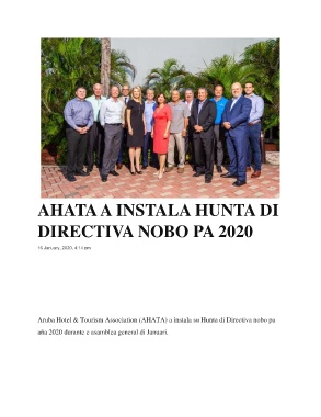 AHATA A INSTALA HUNTA DI DIRECTIVA NOBO PA 2020 16 January, 2020, 4:14 pm 293 Aruba Hotel & Tourism Association (AHATA) a instala su Hunta di Directiva nobo pa aña 2020 durante e asamblea general di Januari.
