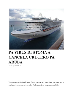 PA VIRUS DI STOMA A CANCELA CRUCERO PA ARUBA 11 February, 2020, 6:45 pm 467 E problemanan ta sigui pa Princess Cruises ora cu un otro barco di nan a haya nan mes cu un plaga di problemanan di stoma den Caribe y cu a forsa nan pa cancela e biahe.