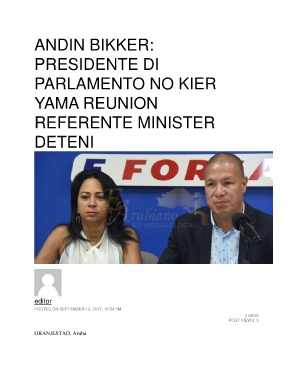 ANDIN BIKKER: PRESIDENTE DI PARLAMENTO NO KIER YAMA REUNION REFERENTE MINISTER DETENI editor POSTED ON SEPTEMBER 13, 2017, 10:54 PM 2 MINS POST VIEWS: 3 ORANJESTAD, Aruba