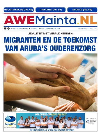 RECAP WEEK 28 [PG. 46] TRENDING [PG. 53] SPORTS [PG. 58] AWEMainta.NL WWW.AWEMAINTA.COM 588-0022 NOTICIA@AWEMAINTA.COM ZaterDag, 12 Juli 2025 LEGALITEIT MET VERPLICHTINGEN: MIGRANTEN EN DE TOEKOMST VAN ARUBA’S OUDERENZORG