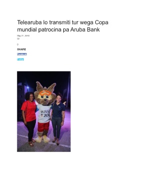 Telearuba lo transmiti tur wega Copa mundial patrocina pa Aruba Bank May 21, 2018 33 0 SHARE Facebook Twitter