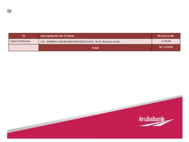TV: TV Description for the TV Show PR Cost in Afl. Canal 22 Noticiero C22 - SHARON DI ARUBA BANK PRESIDENT DI KVK 04:32 Noticiero Anochi 2.570,00 Total Afl. 2.570,00