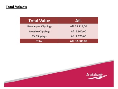 Total Value’s: Total Value Afl. Newspaper Clippings Afl. 23.216,00 Website Clippings Afl. 6.900,00 TV Clippings Afl. 2.570,00 Total Afl. 32.686,00