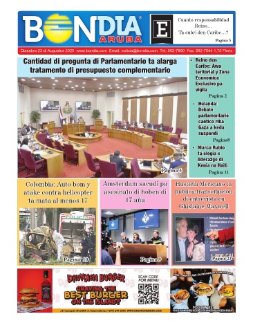 Diasabra 23 di Augustus 2025 www.bondia.com Email: noticia@bondia.com Tel: 582-7800 Fax: 582-7044 1,75 Florin