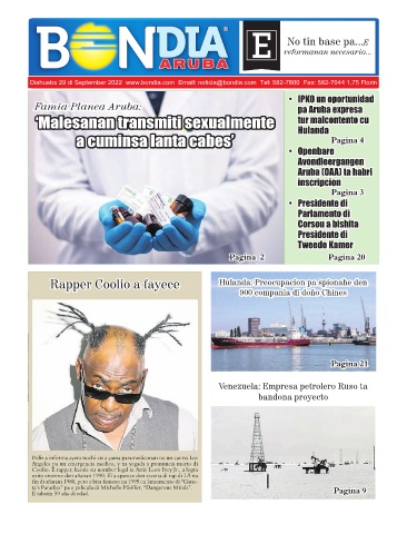 Diahuebs 29 di September 2022 www.bondia.com Email: noticia@bondia.com Tel: 582-7800 Fax: 582-7044 1,75 Florin