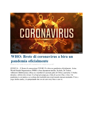 GENEVA – E Brote di coronavirus COVID 19 a bira un pandemia oficialmente. Asina