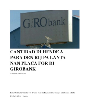 CANTIDAD DI HENDE A PARA DEN RIJ PA LANTA NAN PLACA FOR DI GIROBANK 14 December, 2019, 2:00 pm 1168 Banco Central a vries tur cos di Giro, pa asina haya un miho bista pa loke ta trata loke ta drenta y sali na e banco.