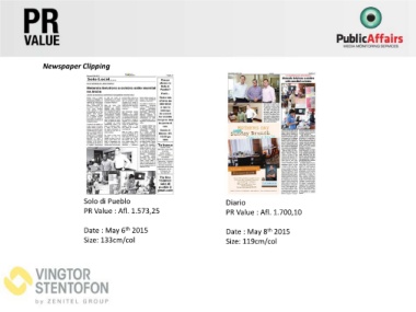 Newspaper Clipping Solo di Pueblo Diario PR Value : Afl. 1.573,25 PR Value : Afl. 1.700,10 Date : May 6th 2015 Date : May 8th 2015 Size: 133cm/col Size: 119cm/col