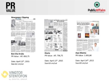 Newspaper Clipping Bon Dia Aruba Diario Awe Mainta PR Value : Afl. 850,75 PR Value : Afl. 796,75 PR Value :1.005,80 Date: April 13th ,2015 Date: April 13th ,2015 Date: April 14th ,2015 Size:62 cm/col Size:63 cm/col Size:69 cm/col