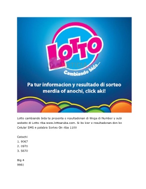 Lotto cambiando bida ta presenta e resultadonan di Wega di Number y subi website di Lotto riba www.lottoaruba.com. Si bo kier e resultadonan den bo Celular SMS e palabra Sorteo On riba 1100 Catochi 1. 9067 2. 0970 3. 5670 Big 4 9961