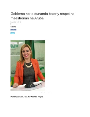 Gobierno no ta dunando balor y respet na maestronan na Aruba November 7, 2019 0 SHARE Facebook Twitter - Advertisement - Parlamentario Jennifer Arends-Reyes