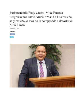 Parlamentario Endy Croes: Mike Eman a desgracia nos Patria Aruba. “Mas bo lesa mas bo sa y mas bo sa mas bo ta compronde e desaster di Mike Eman” November 7, 2019 SHARE Facebook Twitter