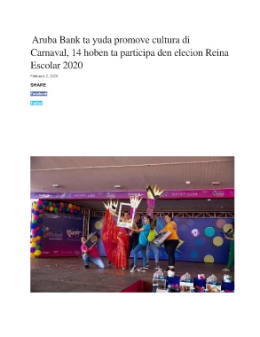 Aruba Bank ta yuda promove cultura di Carnaval, 14 hoben ta participa den elecion Reina Escolar 2020 February 2, 2020 SHARE Facebook Twitter