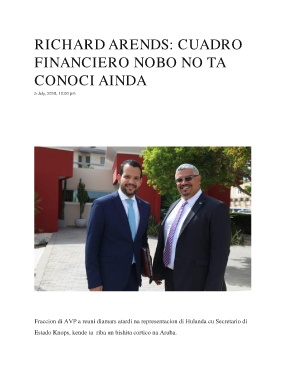RICHARD ARENDS: CUADRO FINANCIERO NOBO NO TA CONOCI AINDA 5 July, 2018, 12:00 pm 61 Fraccion di AVP a reuni diamars atardi na representacion di Hulanda cu Secretario di Estado Knops, kende ta riba un bishita cortico na Aruba.