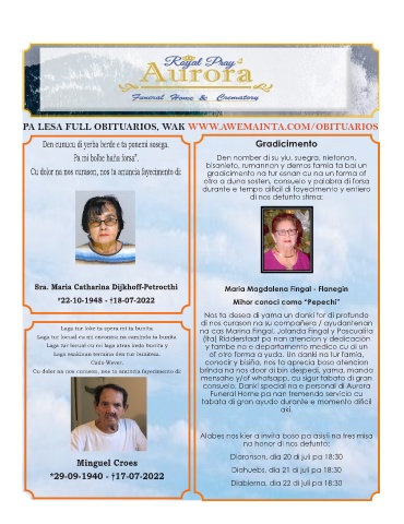 *29-09-1940 - †17-07-2022 Diahuebs, dia 21 di juli pa 18:30