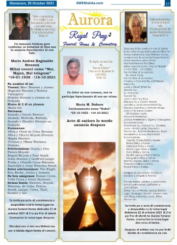 Aurora Funeral Home diahuebs 21 di y despedida cu lo tuma lugar
