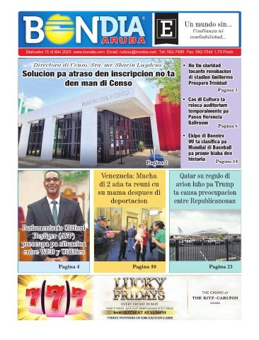 Diahuebs 15 di Mei 2025  www.bondia.com  Email: noticia@bondia.com  Tel: 582-7800  Fax: 582-7044 1,75 Florin