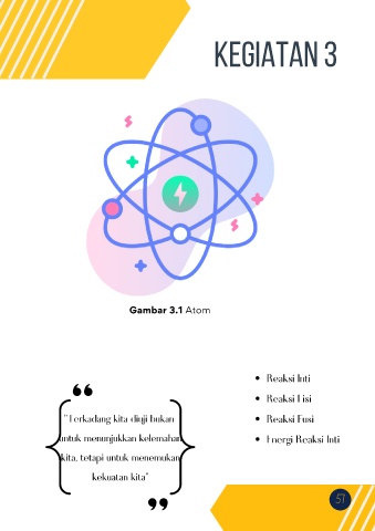 KEGIATAN 3 Gambar 3.1 Atom Reaksi Inti Reaksi Fisi "Terkadang kita diuji bukan Reaksi Fusi untuk menunjukkan kelemahan Energi Reaksi Inti kita, tetapi untuk menemukan kekuatan kita" 57