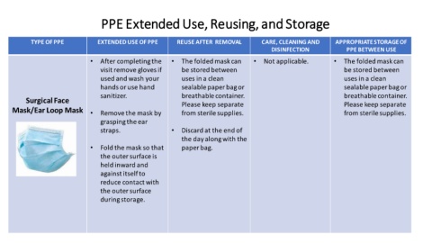 TYPE OF PPE EXTENDED USE OF PPE REUSE AFTER REMOVAL CARE, CLEANING AND APPROPRIATE STORAGE OF