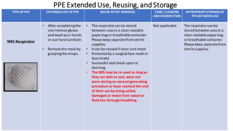 TYPE OF PPE EXTENDED USE OF PPE REUSE AFTER REMOVAL CARE, CLEANING APPROPRIATE STORAGE OF