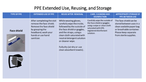 TYPE OF PPE EXTENDED USE OF PPE REUSE AFTER REMOVAL CARE, CLEANING AND APPROPRIATE STORAGE OF