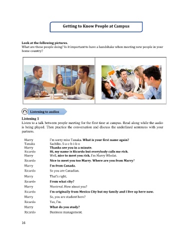 Listen to a talk between people meeting for the first time at campus. Read along while the audio