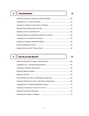 Listening: Listening to audios about likes and dislikes ..................................................46