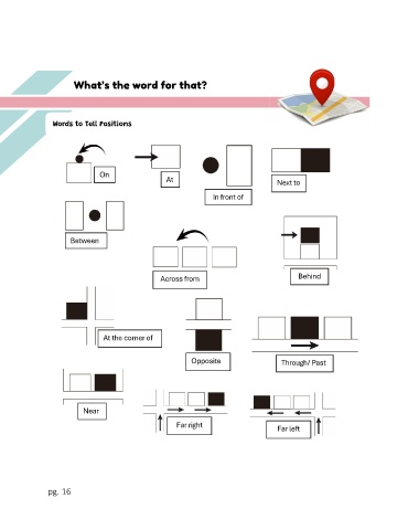 What’s the word for that? Words to Tell Positions On At Next to In front of Between Across from Behind At the corner of Opposite Through/ Past Near Far right Far left pg. 16