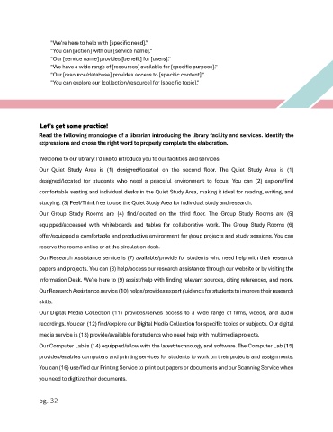 Read the following monologue of a librarian introducing the library facility and services. Identify the
