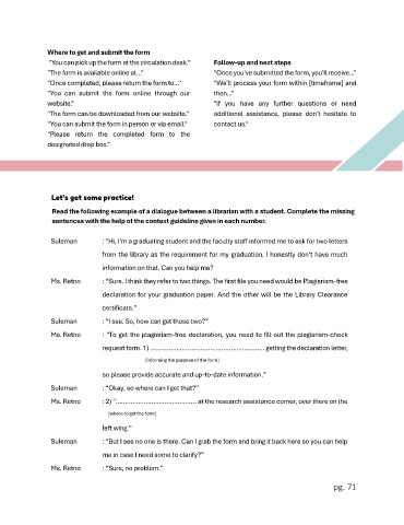 "You can pick up the form at the circulation desk." Follow-up and next steps