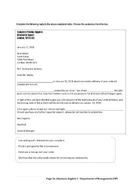 Complete the following reply to the above complaint letter. Choose the sentences from the box.