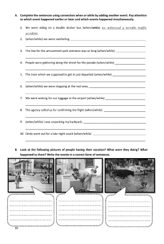 A. Complete the sentences using connectors when or while by adding another event. Pay attention