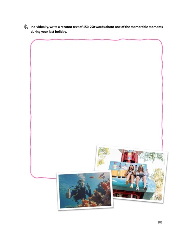 c. Individually, write a recount text of 150-250 words about one of the memorable moments during your last holiday. 105