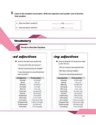 C. Listen to the complete conversation. Write two adjectives each speaker uses to describe