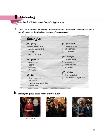a. Listen to the manager describing the appearance of the company party guests. Put a