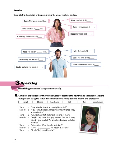 a. Complete the dialogue with provided words to describe the new friend’s appearance. Act the