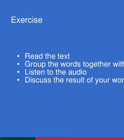 Exercise • Read the text • Group the words together with a partner • Listen to the audio • Discuss the result of your work