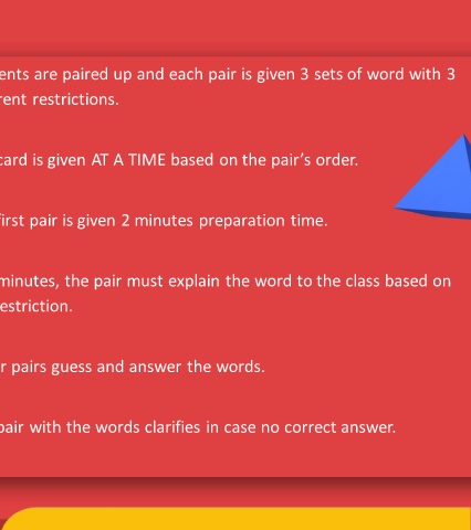 1. Students are paired up and each pair is given 3 sets of word with 3