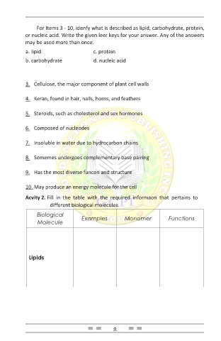 For Items 3 - 10, idenfy what is described as lipid, carbohydrate, protein,