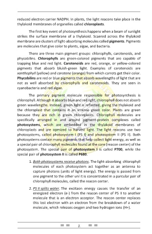 reduced electron carrier NADPH. In plants, the light reacons take place in the