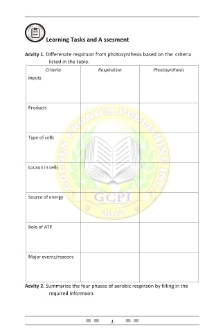Acvity 1. Differenate respiraon from photosynthesis based on the criteria