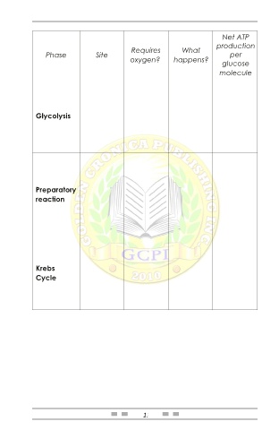 Net ATP production Requires What Phase Site per oxygen? happens? glucose molecule Glycolysis Preparatory reaction Krebs Cycle 132