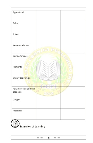 Type of cell Color Shape Inner membrane Compartments Pigments Energy conversion Raw materials and end products Oxygen Processes Extension of Learnin g 12