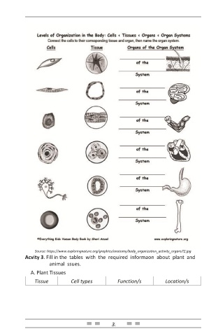 Source: https://www.exploringnature.org/graphics/anatomy/body_organization_activity_organs72.jpg Acvity 3. Fill in the tables with the required informaon about plant and animal ssues. A. Plant Tissues Tissue Cell types Function/s Location/s 33