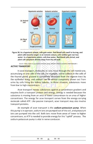 Figure 36. In a hypotonic soluon, cells gain water. Red blood cells swell to bursng, and