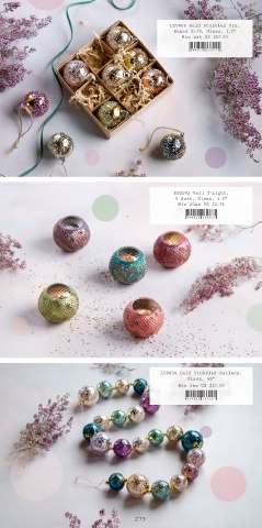 LC0806 Gold Stubbled Orn, Boxed St/9, Glass, 1.5" Min 4st US $17.50 *844828-BDDCCF* RS0092 Ball T-Light, 5 Asst, Glass, 2.5" Min 20ea US $2.75 *844828-BDEGDF* LC0804 Gold Stubbled Garland, Glass, 48" Min 3ea US $37.50 *844828-BDDCAB* 275