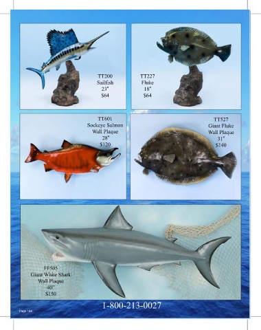 TT200 TT227 Sailfish Fluke 23” 18” $64 $64 TT601 TT527 Sockeye Salmon Giant Fluke Wall Plaque Wall Plaque 28” 31” $120 $140 FF505 Giant White Shark Wall Plaque 40” $150 1-800-213-0027 Page 168