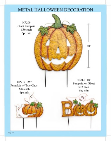 METAL HALLOWEEN DECORATION HP209 Giant Pumpkin $30 each 6pc min 40” HP213 18” HP212 25” Pumpkin w/ Ghost Pumpkin w/ Two Ghost $12 each $14 each 6pc min 6pc min Page 174