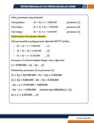 Hari ketiga : 3x + 5y + z = 6.550.000 persamaan (3)